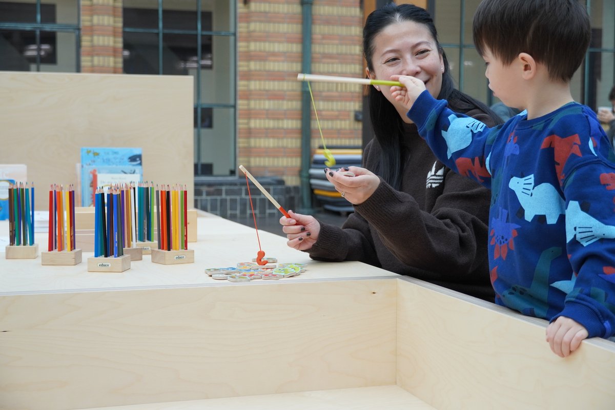 Moeder en kind vissen samen met speelgoedhengels bij het Doe-eiland